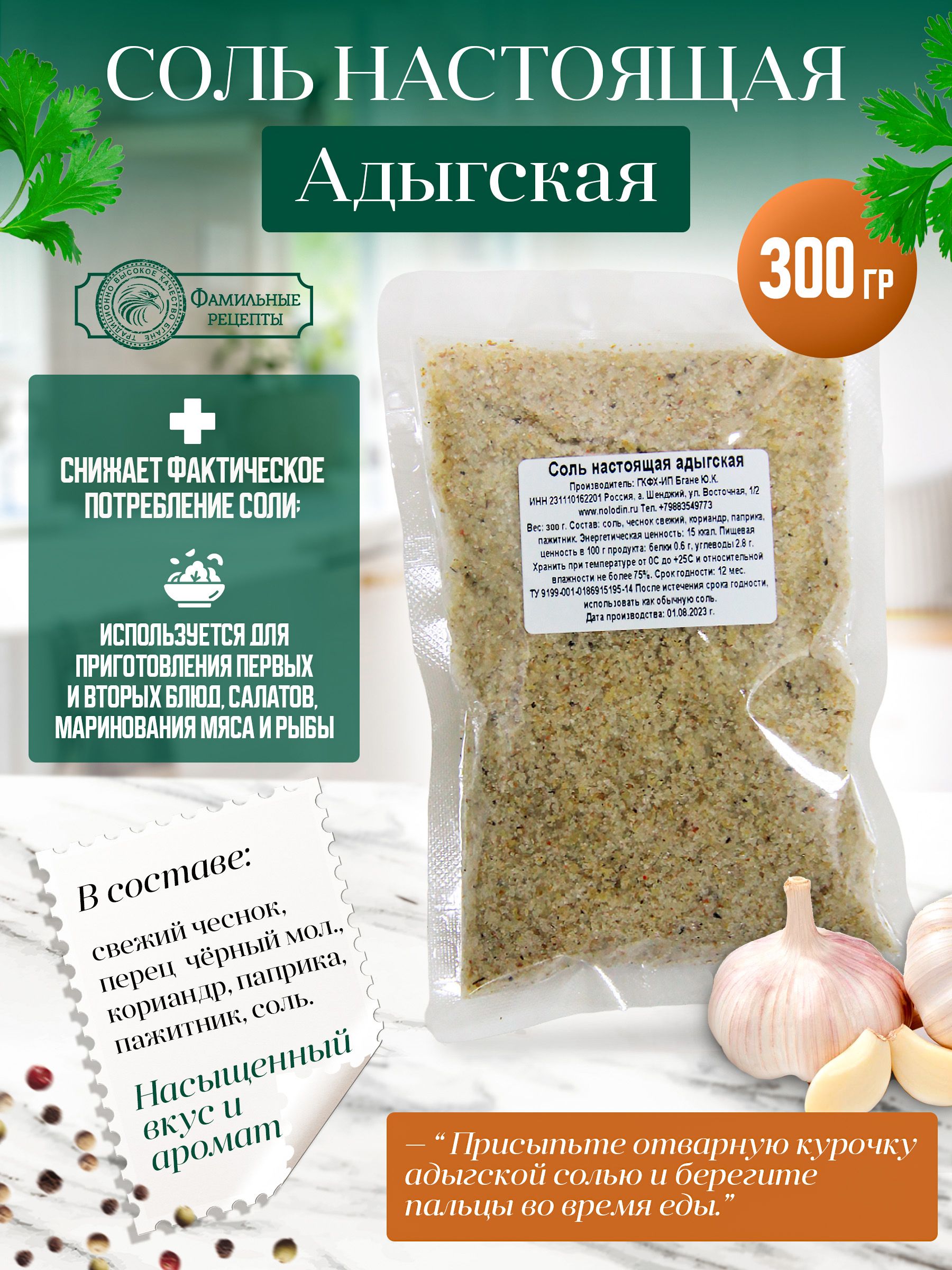 Вес 250 г. Состав: Соль поваренная пищевая каменная, чеснок, перец черный молотый, кориандр, паприка, пажитник. Срок хранения 12 мес. Дата производства указана на упаковке. После истечения срока годности, использовать как обычную соль. Хранить при относительной влажности 75%. Температура хранения 0-25 С.